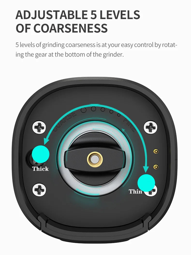 • 5-Level Adjustable Coarseness. Choose the coarseness of grains according to your preference. Rotate the knob on the bottom clockwise for a finer grind or anticlockwise for a coarse grind. Utilize the durable and safe 304 stainless steel drive shaft to bring spices into wanted granular sizes. Spread freshly ground spices for added flavor and taste.