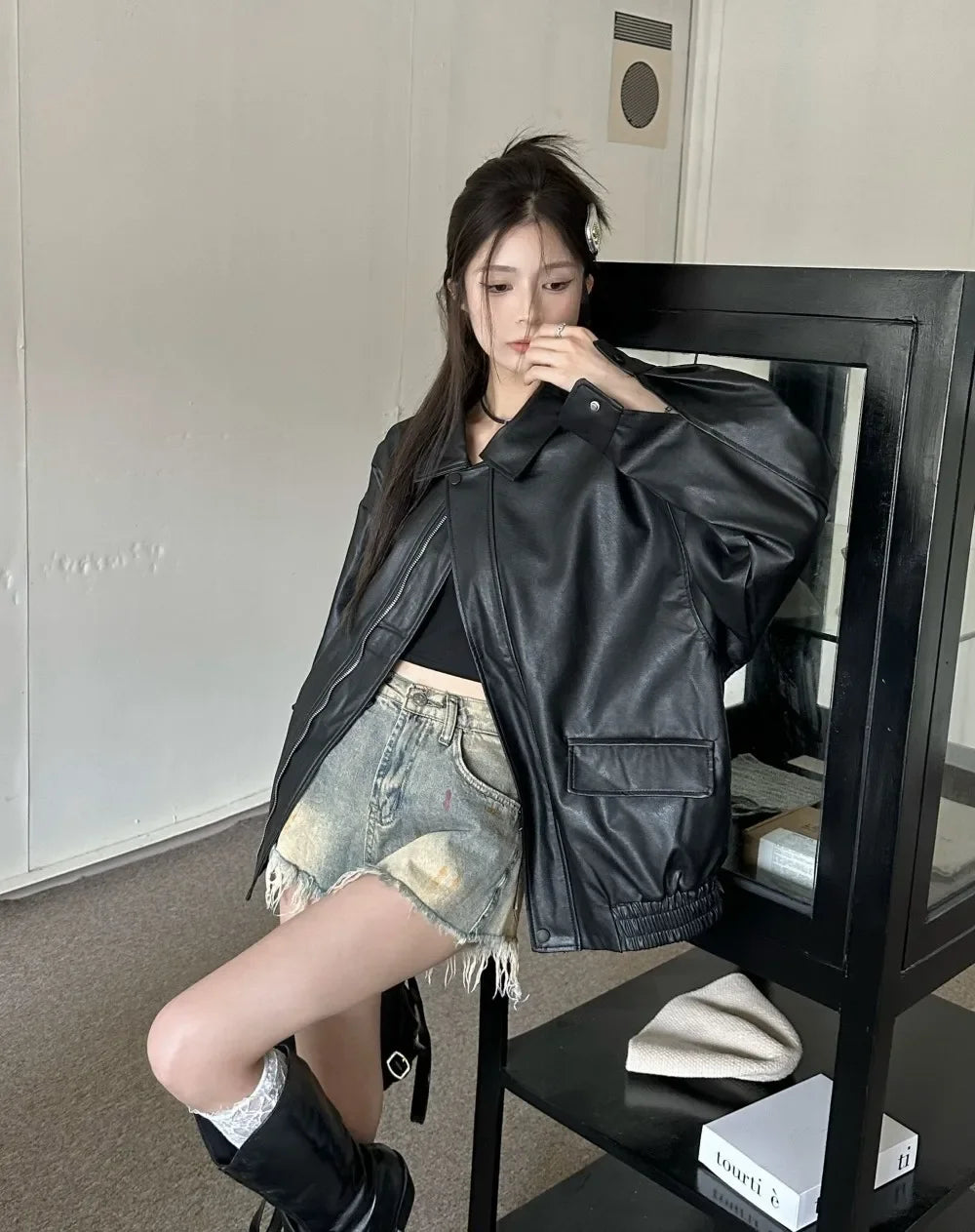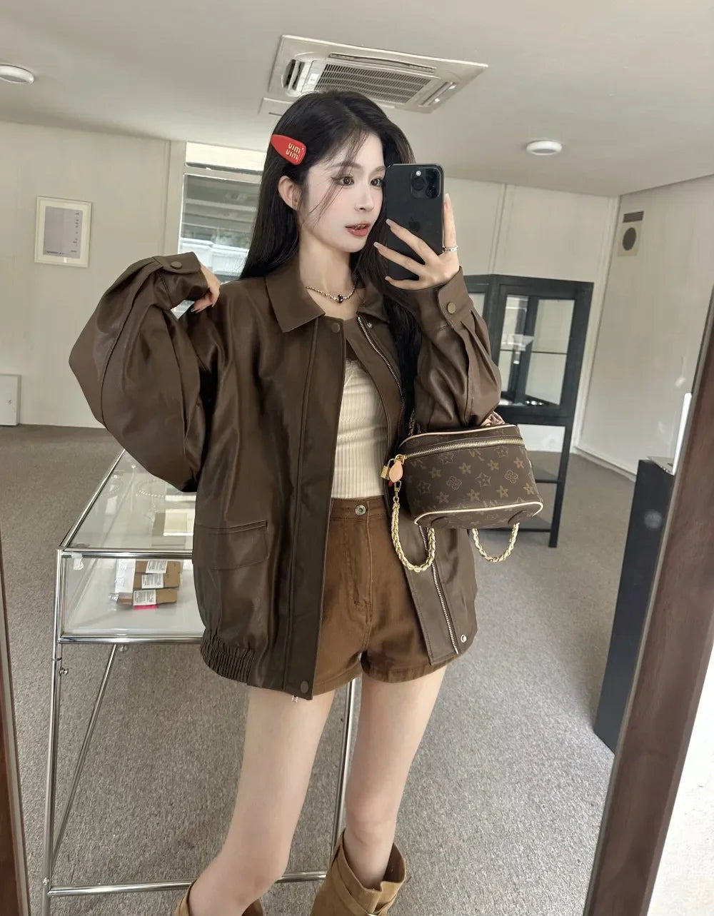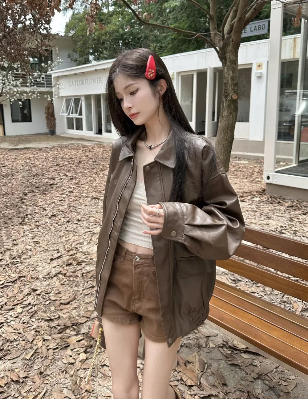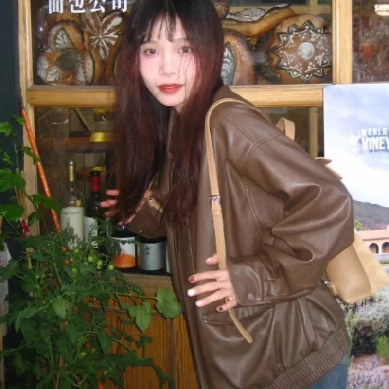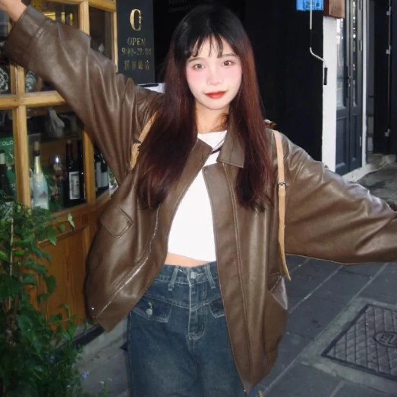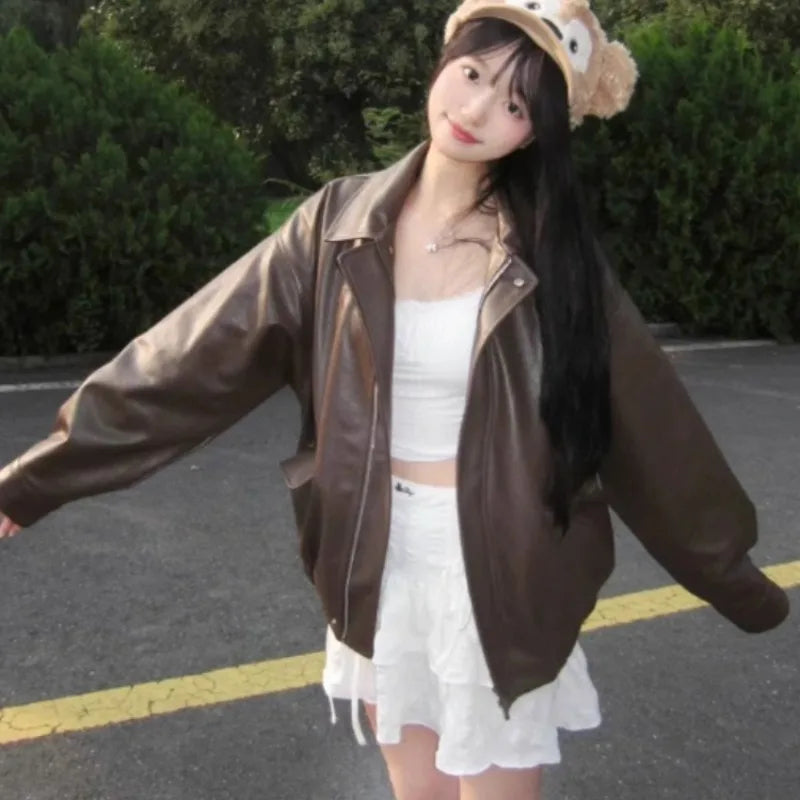 American Retro Solid Pu Jackets Women Autumn Sweet Cool Tops PU Baggy Cozy Turn-down Collar Zipper Fashion Stylish Temperament