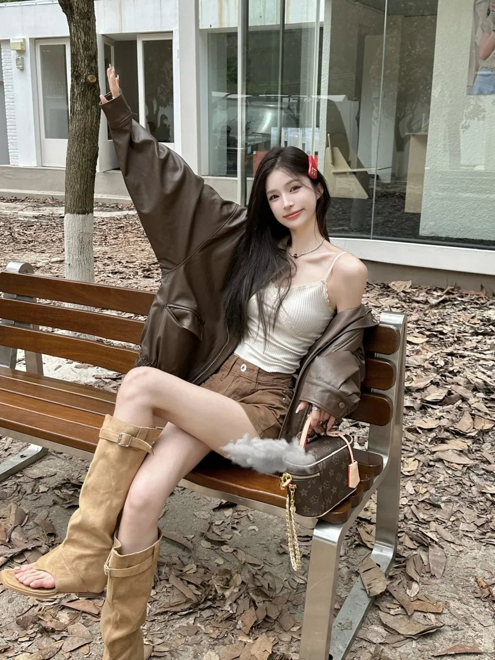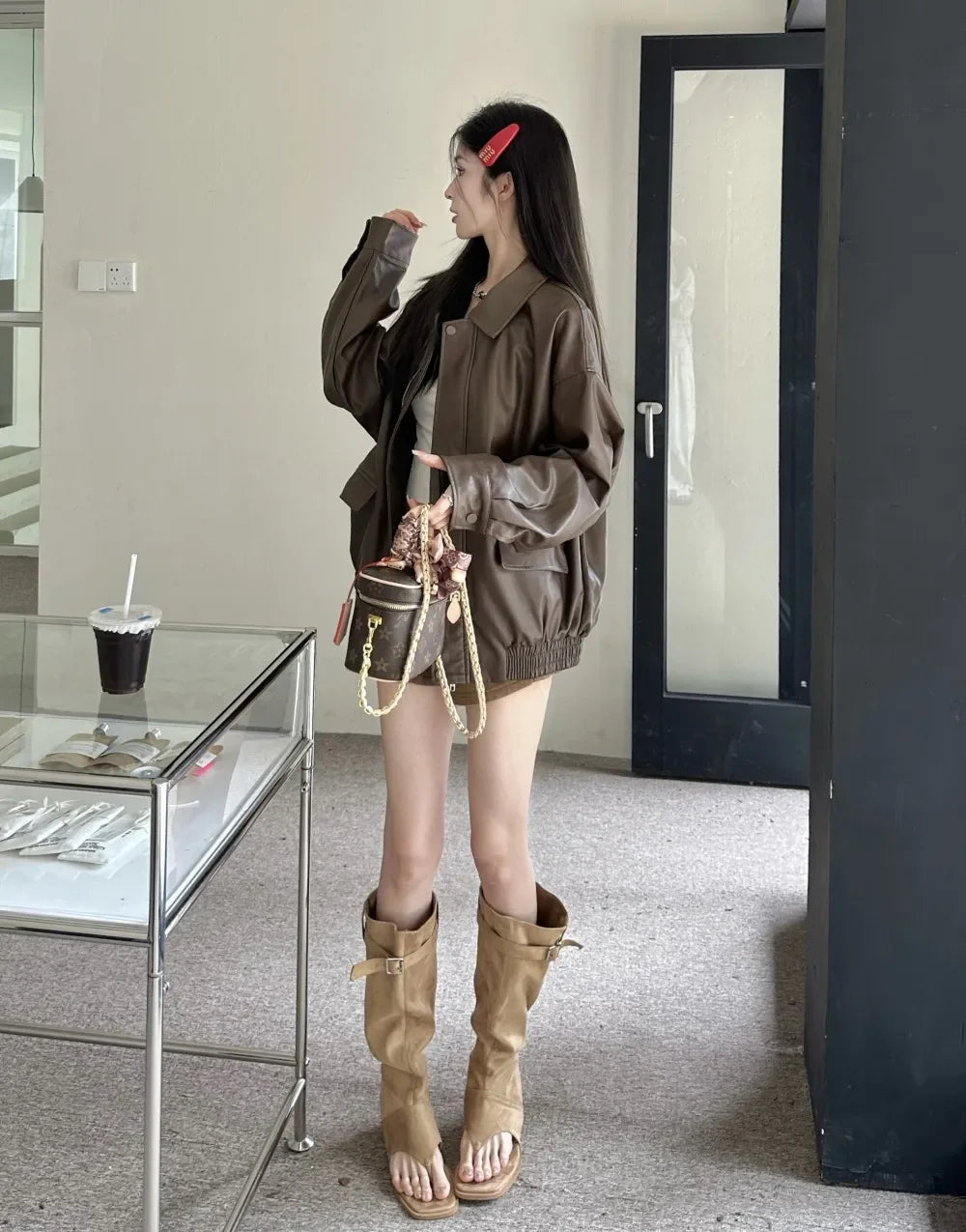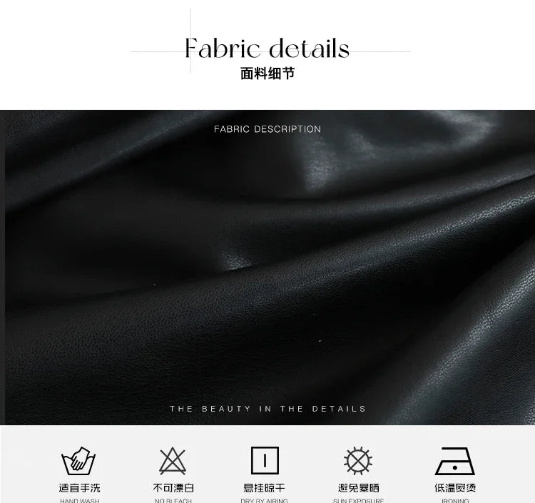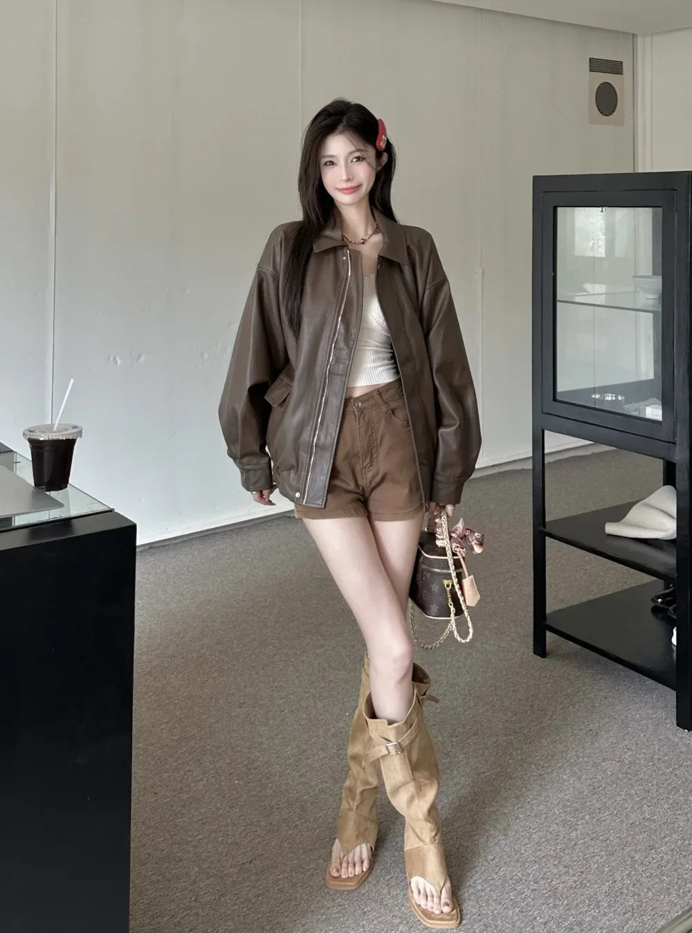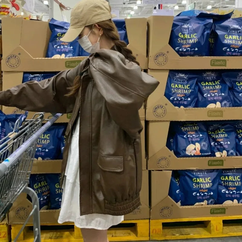 American Retro Solid Pu Jackets Women Autumn Sweet Cool Tops PU Baggy Cozy Turn-down Collar Zipper Fashion Stylish Temperament