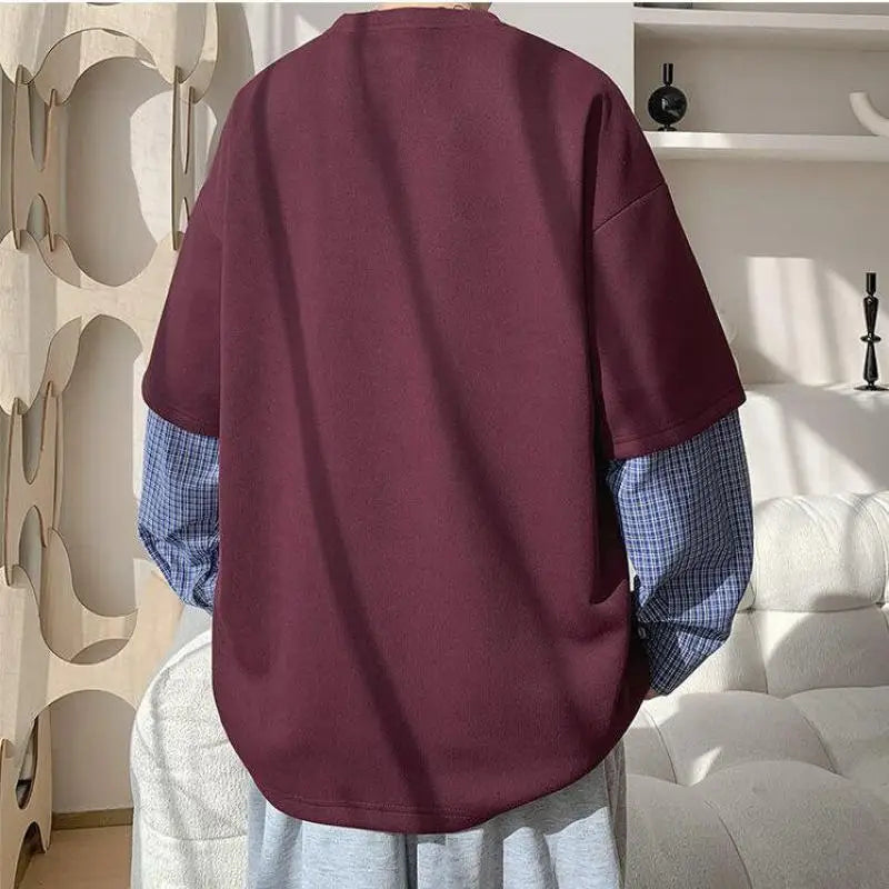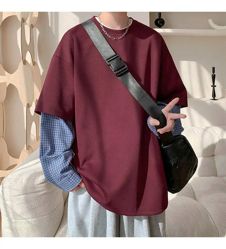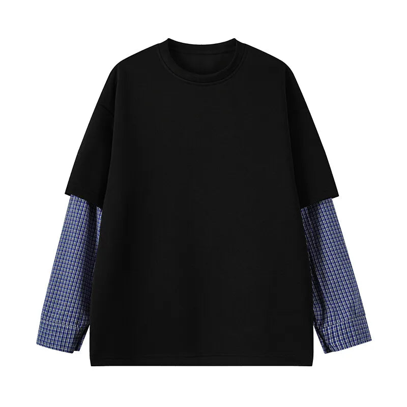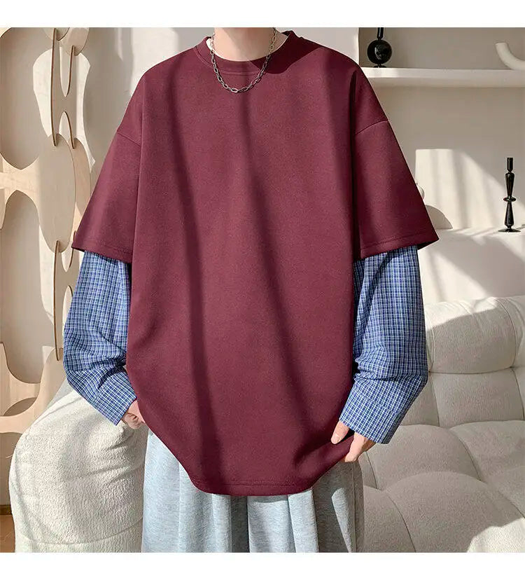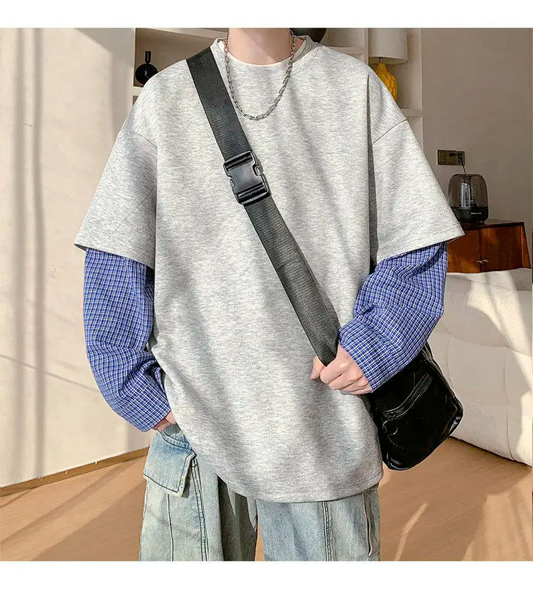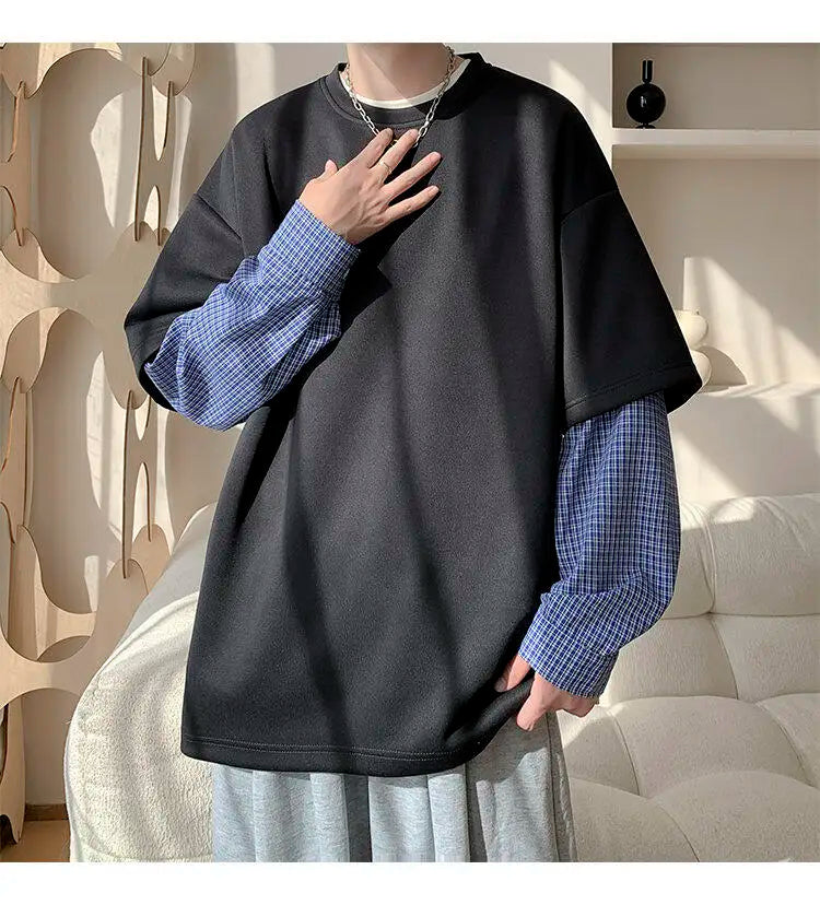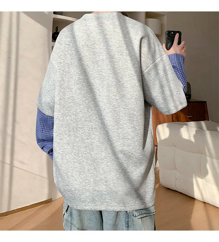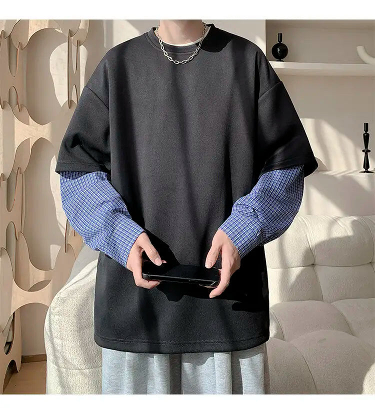 Fashion Oversized Solid Color Fake Two-Piece Hoodie with Checkered Sleeves Trendy Plus Size Pullover for Men and Women Autumn