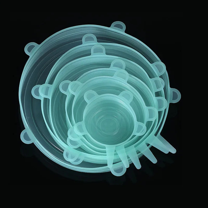 clear silicone covers in various sizes. Thanks to their stretchable material, the food lids will easily fit most bowls, pots, containers, mugs, cups, cans, jars, and you can even use them to cover your half-cut melon or watermelon.