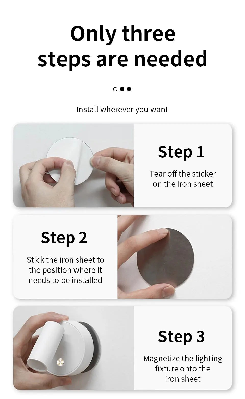 • Multiple Occasion Use This peel and stick sconce lights can be placed anywhere you need extra illumination, without requiring a charging cord. It functions as a table lamp, wall lamp, and even a hand-held flashlight for added convenience. Perfect for use in a variety of settings, including bedside, drawers, cupboards, fridge doors, stairways, hallways, and more. With its portability, there's no limit to where you can use it.