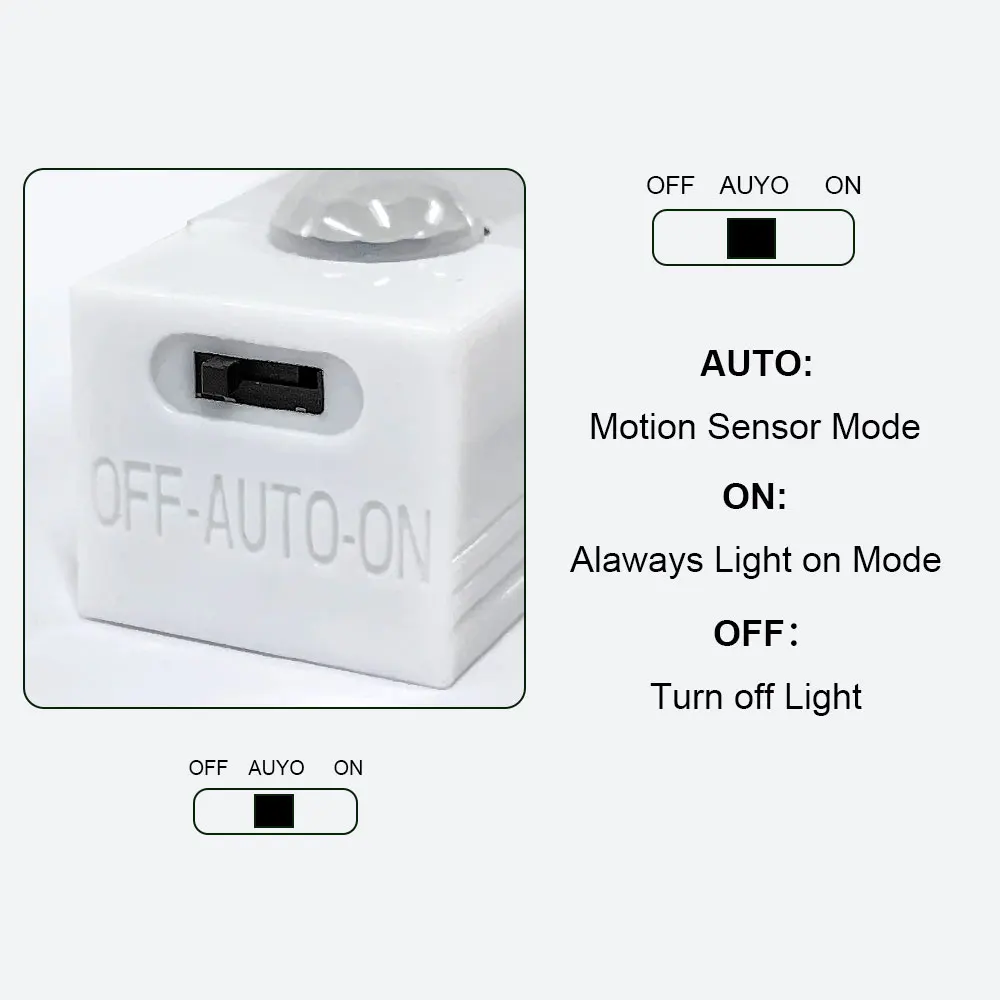 3、If the environment bright enough the lamp will stop work,if darker than 10Lux will work again while there has people around 0-6 meters.And will turn off again after you leave 20 seconds later.