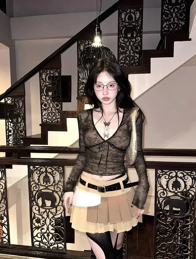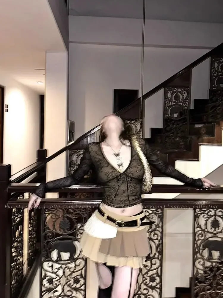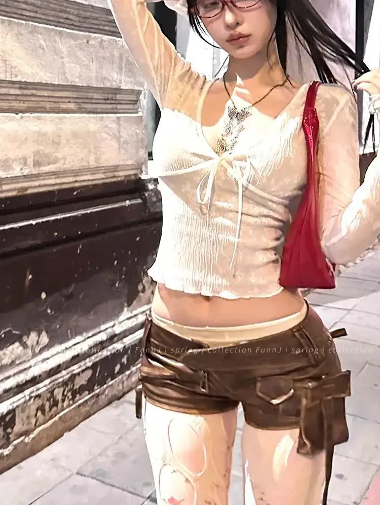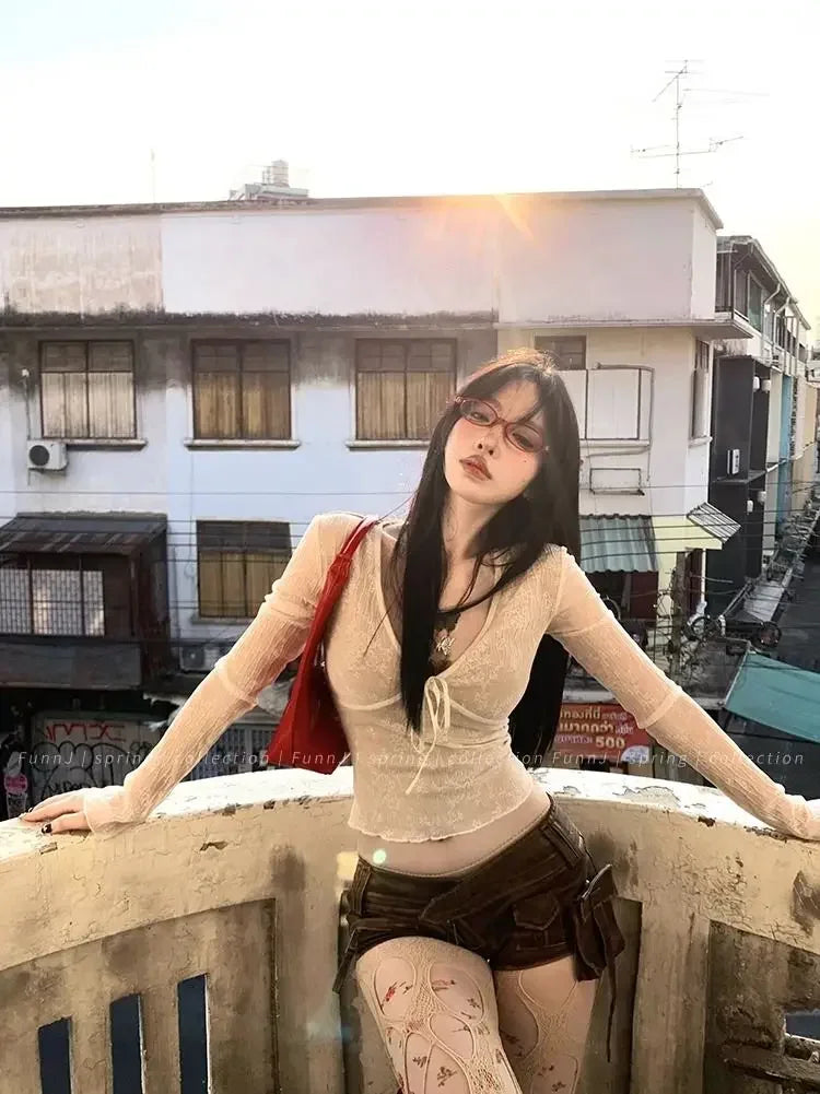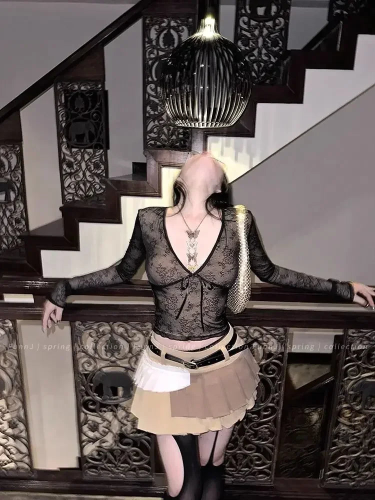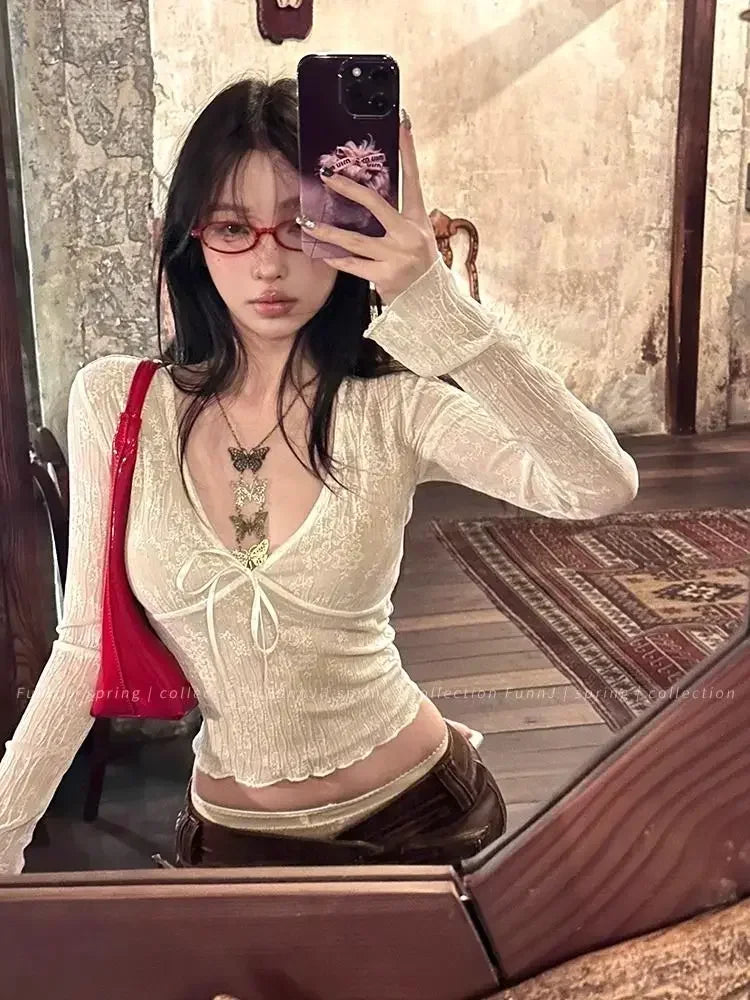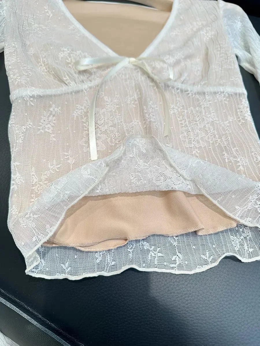 Coquette Aesthetic Mesh T Shirts Women Vintage V Neck Lace Bow Cropped Tops Y2k Sexy Slim Fit Long Sleeve Tee Shirts