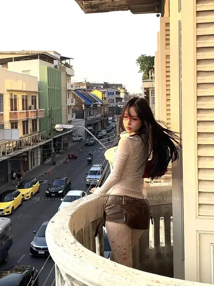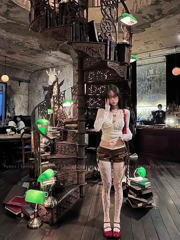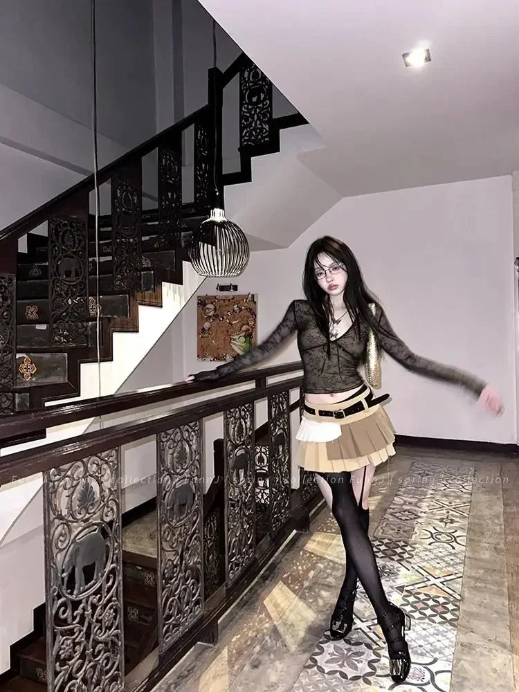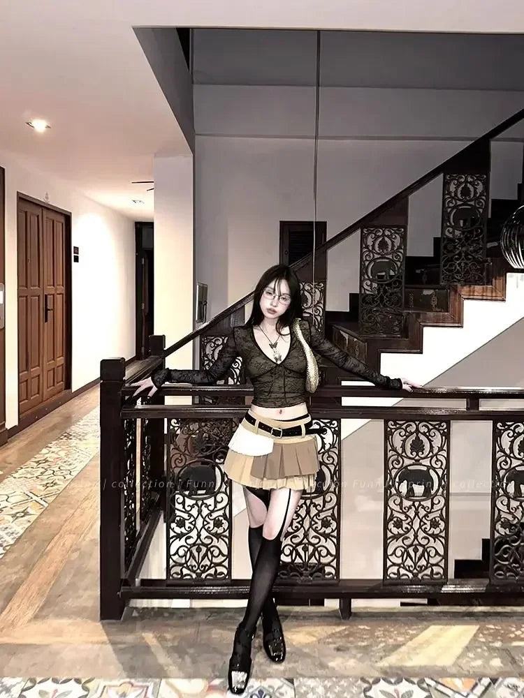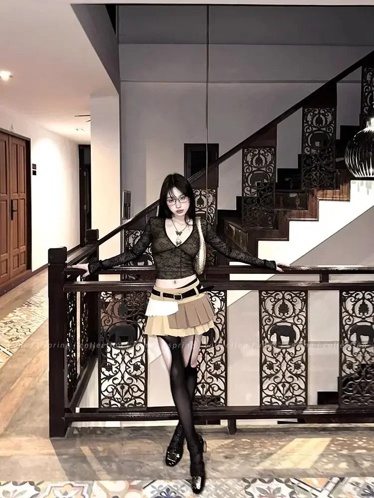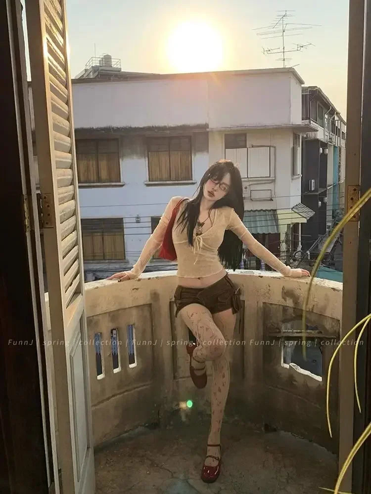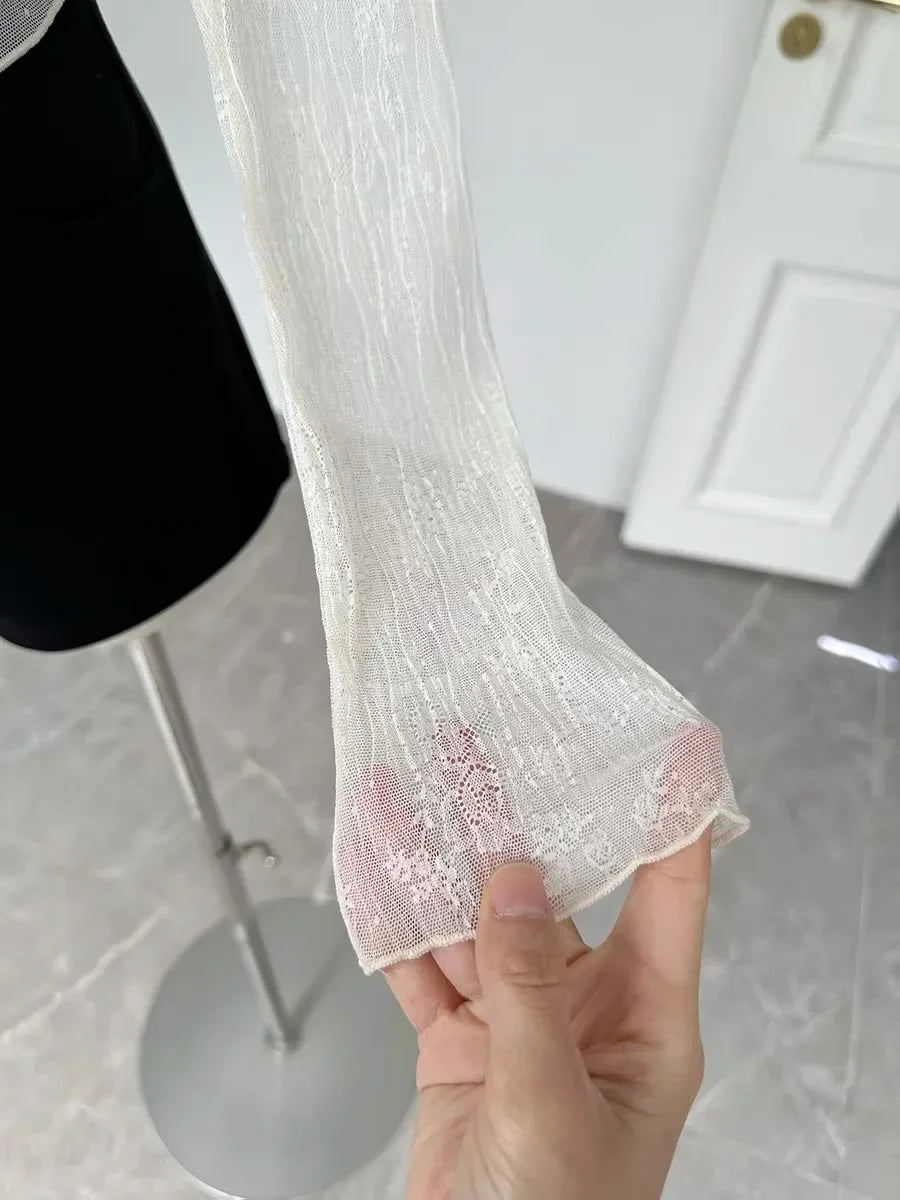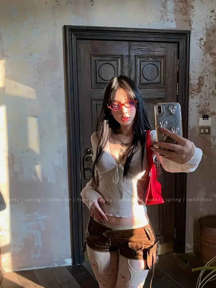 Coquette Aesthetic Mesh T Shirts Women Vintage V Neck Lace Bow Cropped Tops Y2k Sexy Slim Fit Long Sleeve Tee Shirts