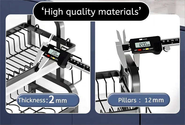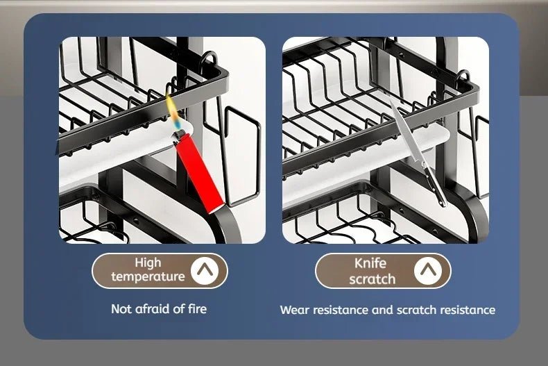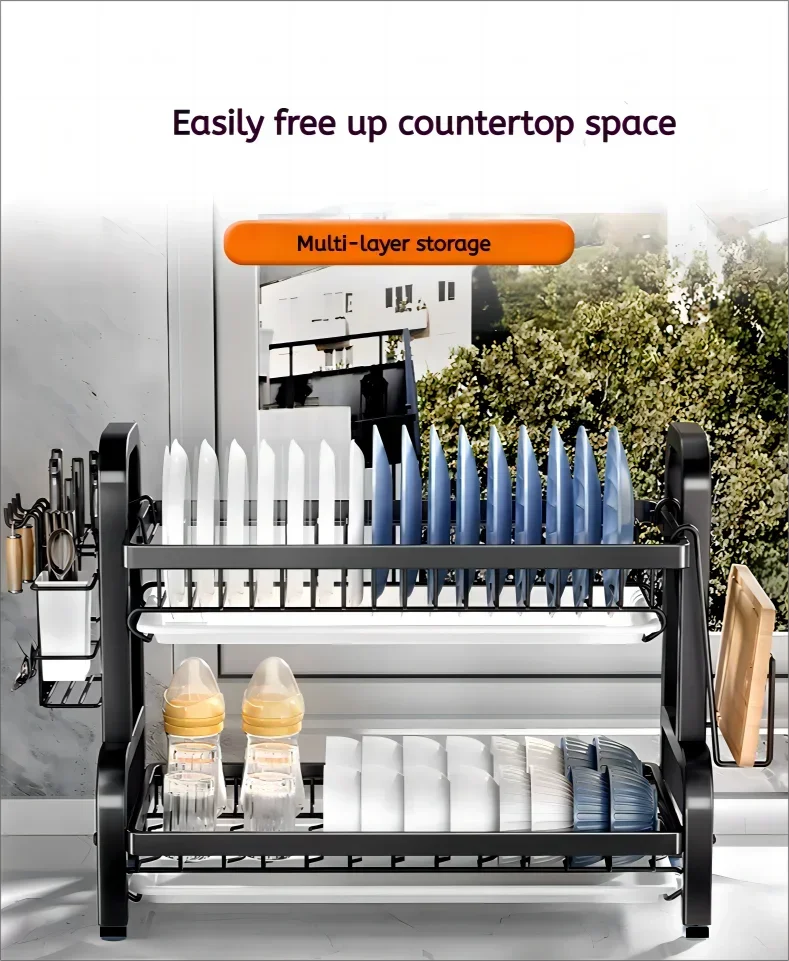 Bullet Points:1.Heavy-Duty Support: Our dish drying rack is built to withstand heavy usage. Crafted from thick carbon steel materials, it is sturdy, and durable, and can securely hold your dishes without wobbling or tipping over. Enjoy long-lasting support for your dish-drying needs.2.Helpful and Useful: Prevent messy counters in your kitchen by using this anti-rust dish rack that features a built-in moisture drain pipe for quick drying.3.Convenient Utensil Access: Our dish drying rack features a well-designed integrated structure, with accessible zones for your utensils. Save time and effort with ease.4.Wide Range of Uses: Keep your countertop organized with our widely applicable dish drying rack that can efficiently dry saucers, cups, bowls, chopsticks, plates, and dishes.