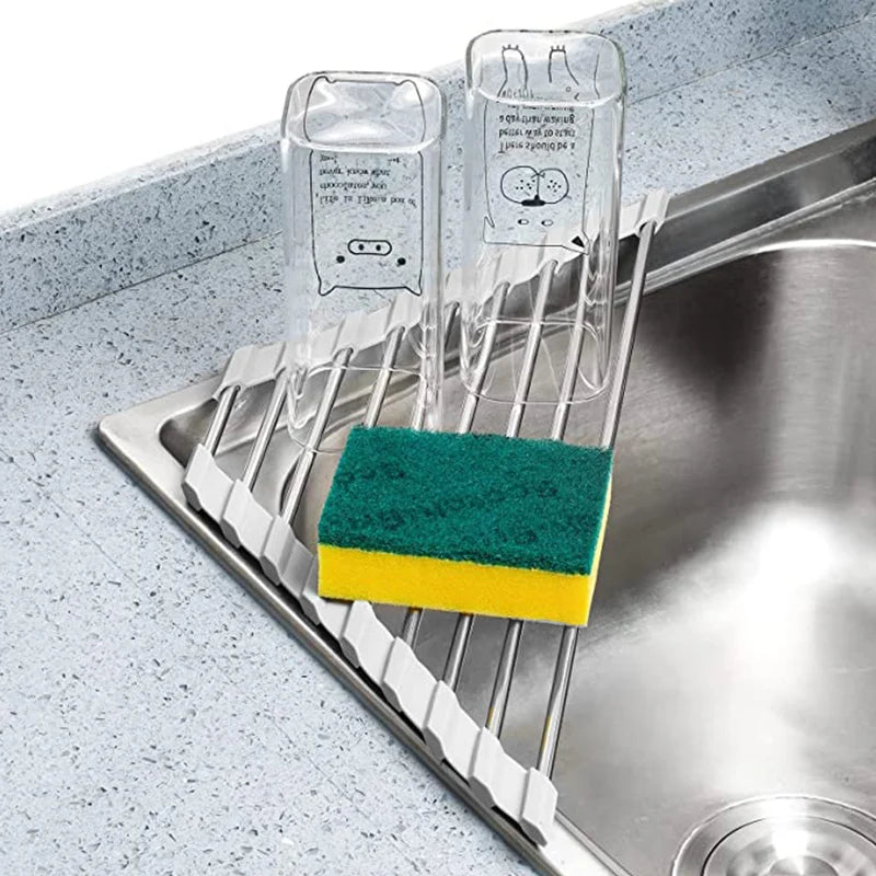 Triangle Roll-Up Dish Drying Rack for Sink Corner Foldable Stainless Steel Caddy Sponge Shelf Holder Kitchen Drainer Organizer