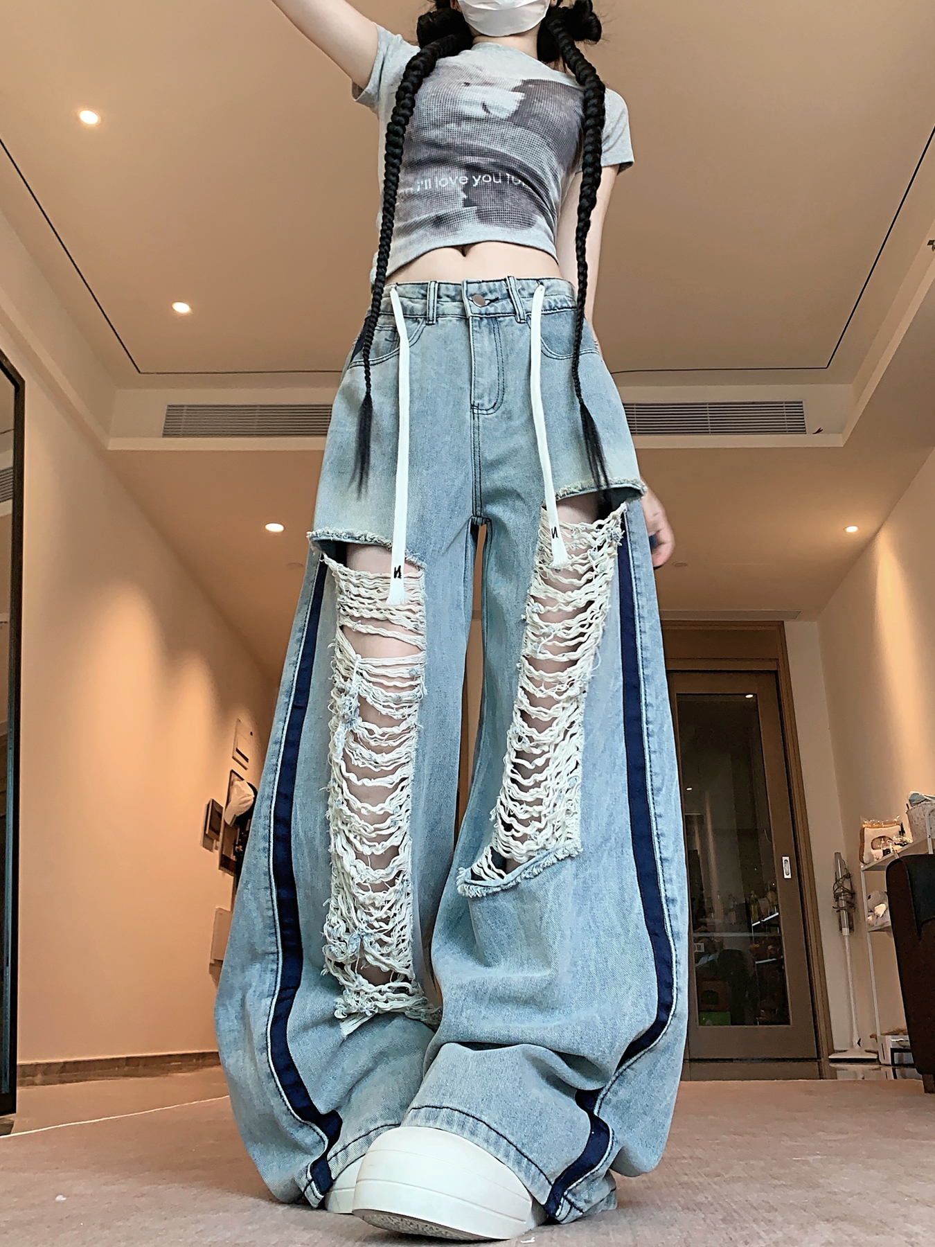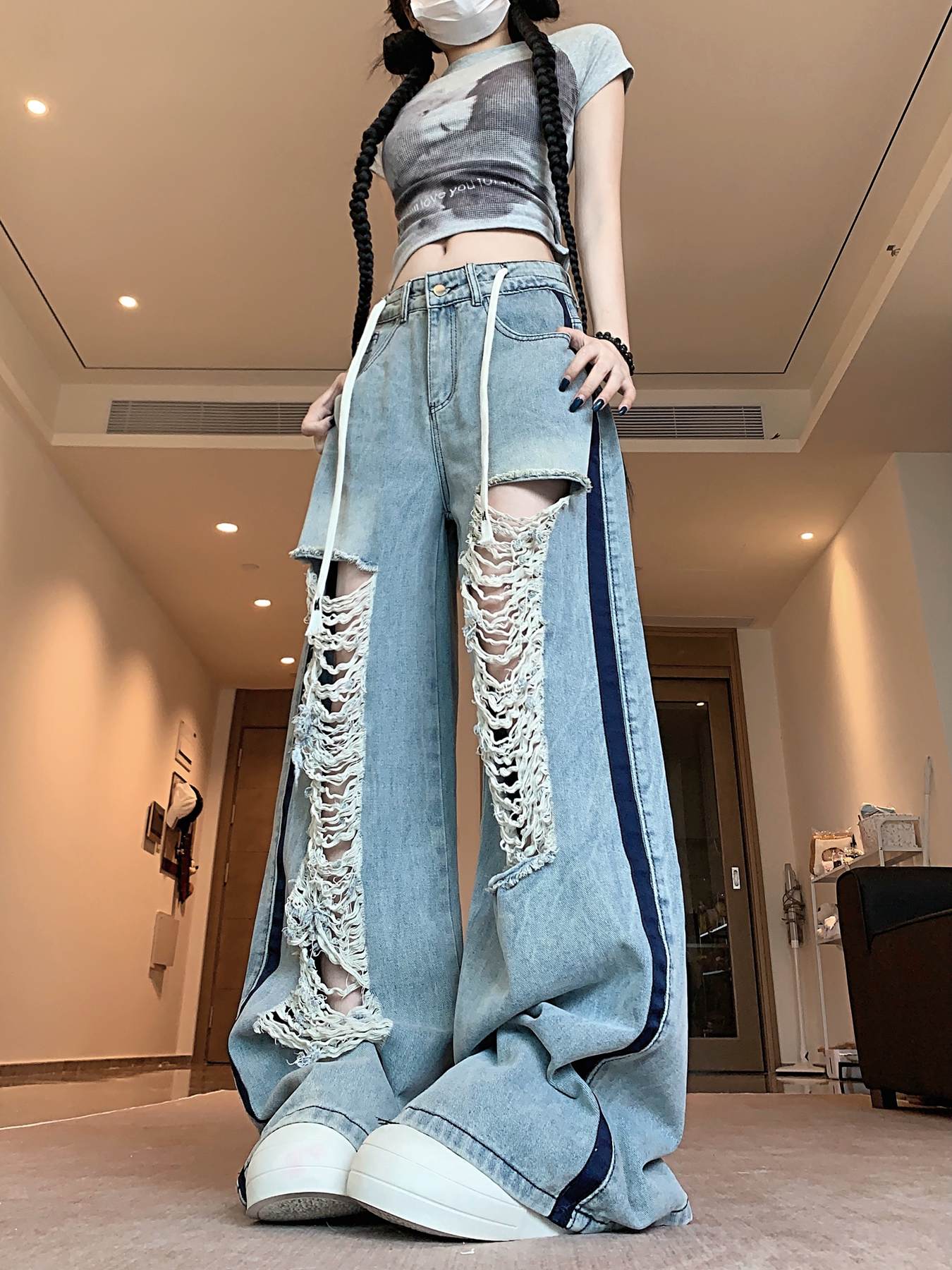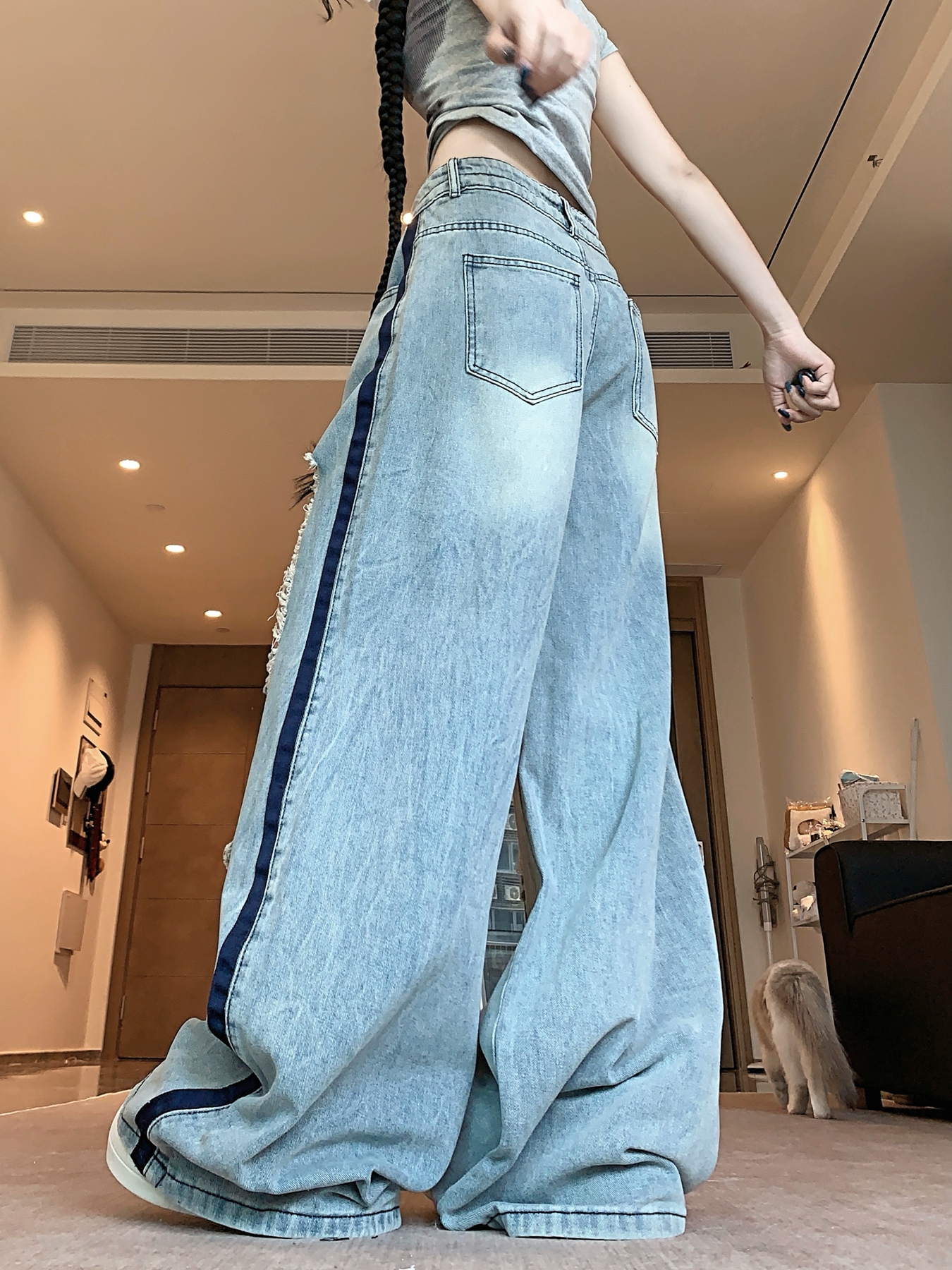 American ripped jeans with loose design, retro spicy girl blue lazy straight leg pants