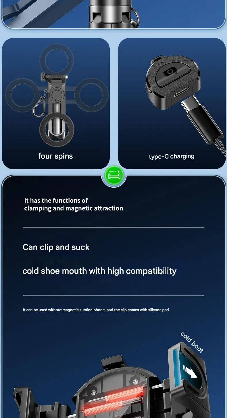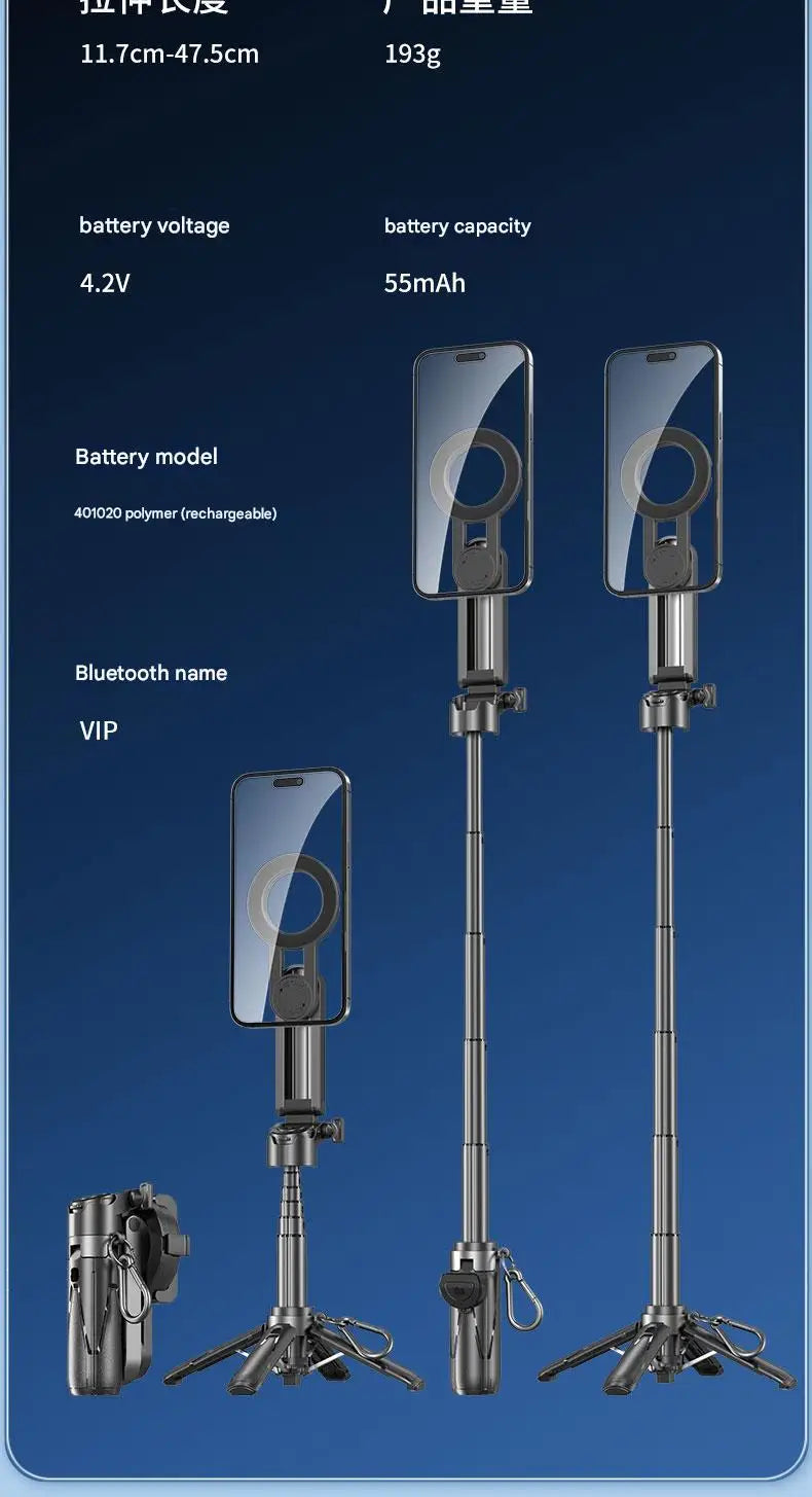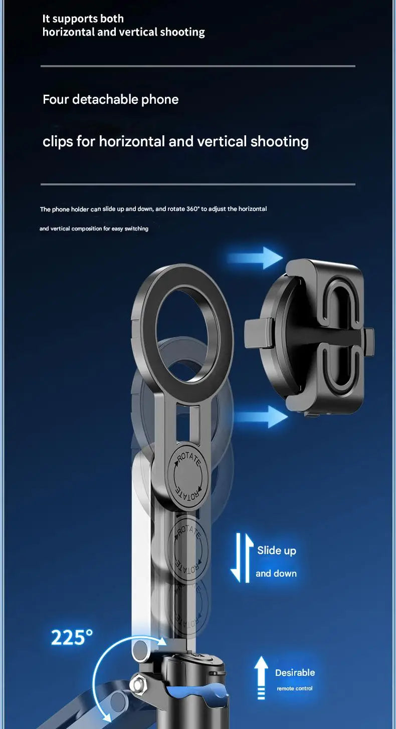 Upgrade your content creation setup with this multi-function foldable magnetic phone holder selfie stick. Designed for modern creators, it combines a tripod, selfie stick, and magnetic mount in one compact tool. Featuring DSLR-style 360° rotation, a wireless Bluetooth remote, and strong MagSafe compatibility, it lets you capture stunning shots, vlogs, and videos effortlessly — anytime, anywhere.